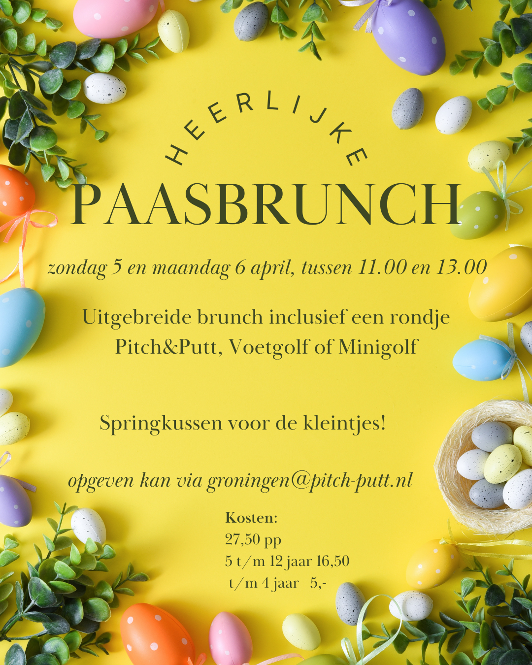 Kom gezellig langs met de familie of vrienden voor een lekkere brunch, inclusief een rondje spelen! Je kunt kiezen uit alle activiteiten en voor de kleintjes is er een springkussen.